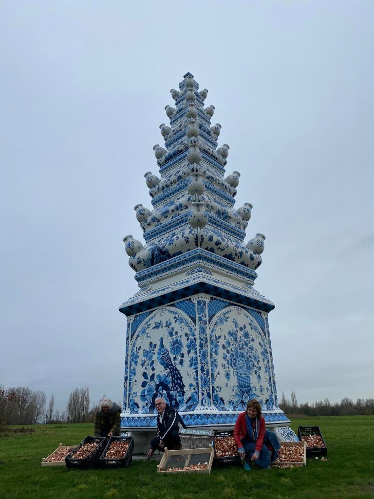 この巨大デルフト焼きのチューリップ花瓶の周りには1万株のチューリップの球根が植えられ、暖かくなるにつれ開花を始めています。