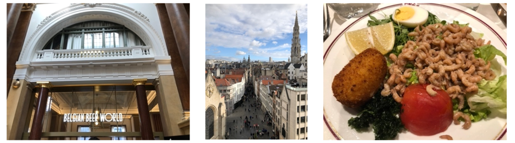 左:ベルギービールワールド 中央:ルーフトップバーから眺めるグランプラスの市庁舎の塔 右:オザルム・ド・ブリュッセルでいただいた小海老のコロッケ