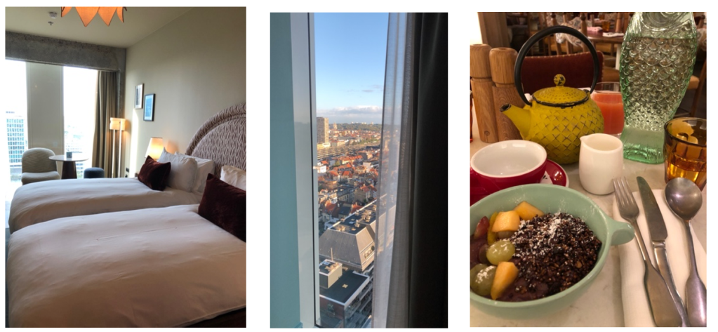 今回、ブリュッセルに2泊したホテルは、HOXTON Brussels。ブリュッセル北駅に近い、サステナビリティを意識したホテルです。例えば、朝食はブッフェスタイルではなくメニューから選ぶアラカルテ。その内容も「アサイボウル」や「キノアパンケーキ」などちょっととんがっています。ホテルスタッフも制服がなく、Tシャツにジーンズといったラフな装いで、よく見ると、名札(ファーストネーム)をつけています。全体的に意識高い系の人をターゲットにしている意識高いホテルという印象でした。